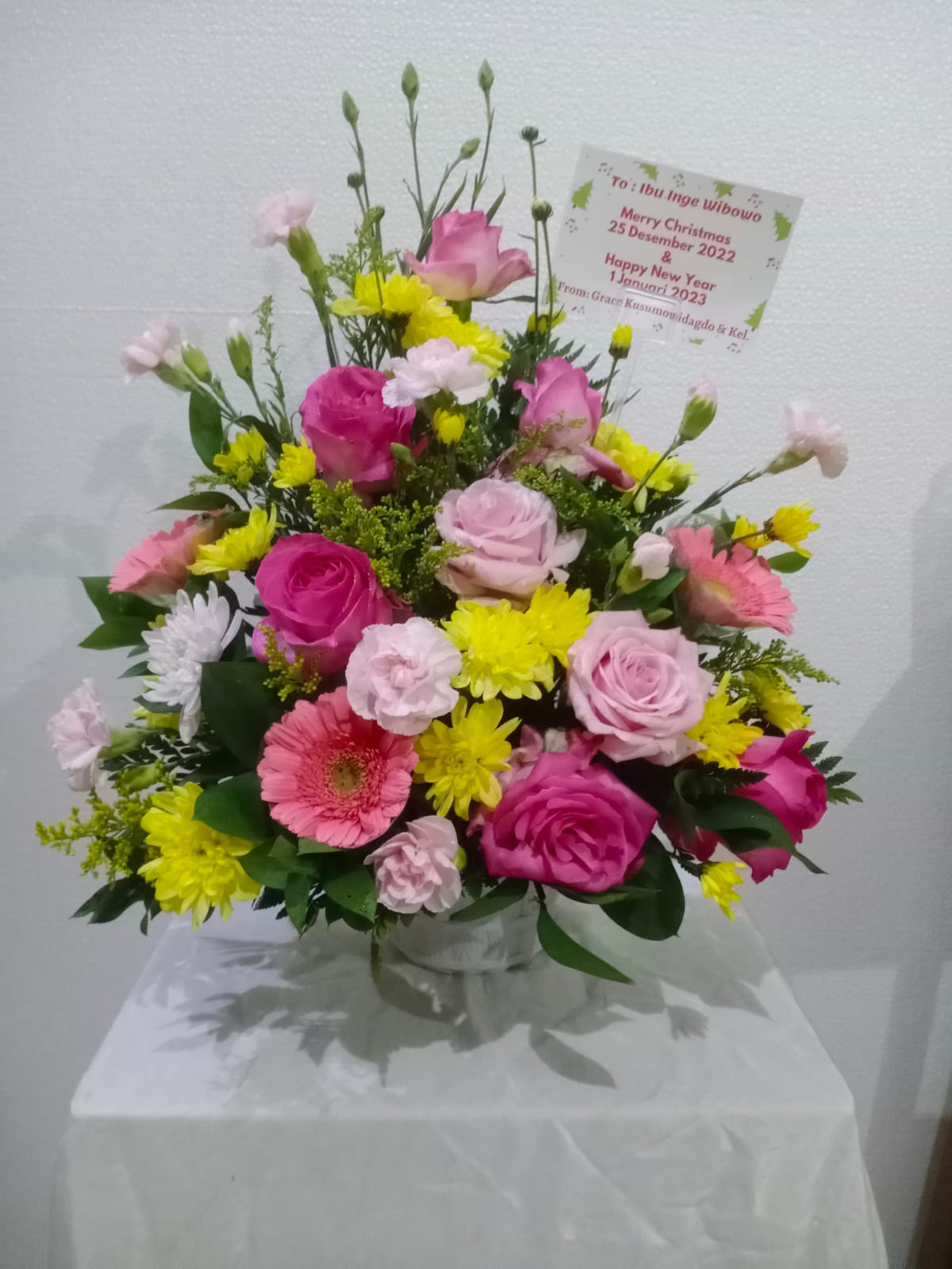 Rangkaian bunga meja segar yang cocok untuk hiasan rumah, kantor, hotel, atau sebagai hadiah.